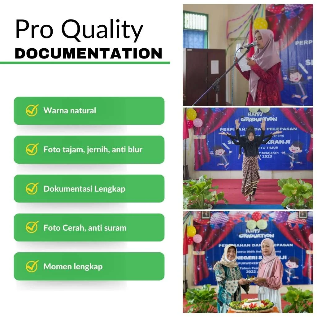 Memang bisa ambil foto pakai hp saat anak-anak tampil manggung di acara pelepasan. Tapi, karena diambil dari jauh, foto atau videonya terlihat kecil. Kalau anaknya di baris kedua, tambah tidak kelihatan dan tidak ada dokumentasinya. Dengan fotografer profesional, wali murid, murid, dan juga guru bisa dapatkan foto acara tanpa kerepotan. Semua bisa dapat file yang terlihat pro untuk diupload ke media sosial atau bahkan dicetak.